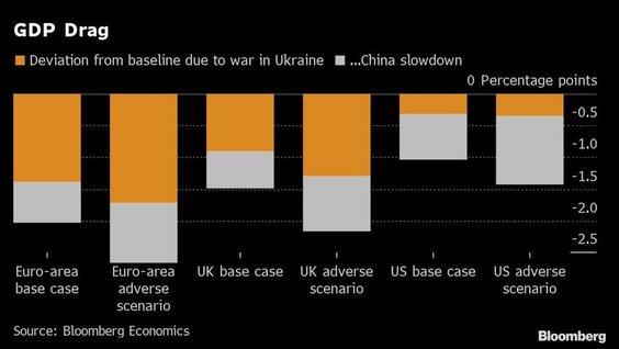 Niekorzystny scenariusz ekonomistów przewiduje jeszcze wolniejszy wzrost w Chinach, większe kurczenie się w Rosji i większe załamanie na giełdzie. Wojna u progu strefy euro w nieproporcjonalny sposób wpłynęła na region i jest jednym z powodów, dla których Europejski Bank Centralny ma rozpocząć w lipcu podnoszenie stóp procentowych po raz pierwszy od ponad dekady.