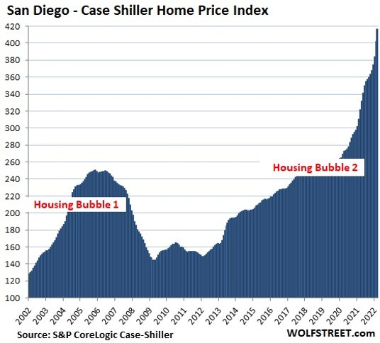 Już wiele oznak wskazywało, że rynki sprzedaży istniejących domów i nowych domów napotkały trudności przy obecnych oprocentowaniu kredytów hipotecznych na poziomie ponad 5 proc., w tym gwałtownie spadającym wolumenie sprzedaży i rosnącym zapasom w istniejących domach oraz spadającej i rekordowej sprzedaży zwiększanie zapasów w nowych domach. Jednak dane Case-Shiller Index jeżą włosy przed tymi zmianami na rynku o kilka miesięcy, a zamiast tego odzwierciedlają okres, w którym szalona przepychanka trwała, aby zablokować oprocentowanie kredytów hipotecznych przed jeszcze większym wzrostem i kupić dom, dowolny dom, za wszelką cenę, zanim wygaśnie blokada kursu z poprzednich miesięcy - pisze Wolf Richter, dyrektor generalny Wolf Street Corp. i redaktor naczelny Wolf Street, gdzie analizuje kwestie gospodarcze, biznesowe i finansowe, wybryki Wall Street, uwikłania europejskie, niepowodzenia i możliwości w USA, Europie, Japonii i czasami w Chinach.