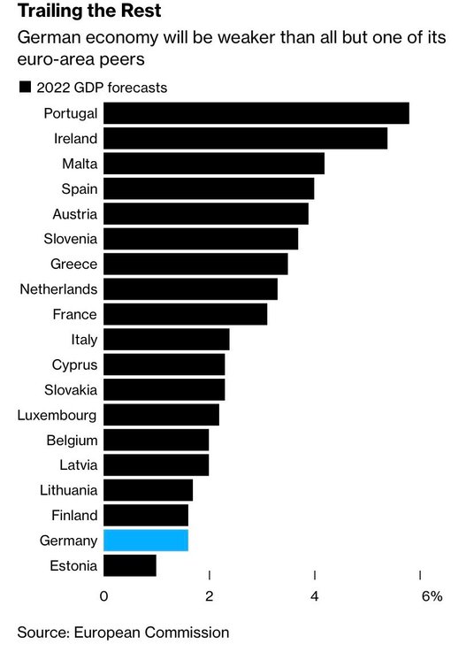 Komisja Europejska przewiduje, że tylko Estonia odnotuje w tym roku wolniejszy wzrost gospodarczy niż Niemcy – z powodu podobnych skutków, ale bliższej odległości od Rosji – podczas gdy oczekuje się, że inflacja w obu krajach będzie wyższa niż średnia dla 19 krajów strefy euro.