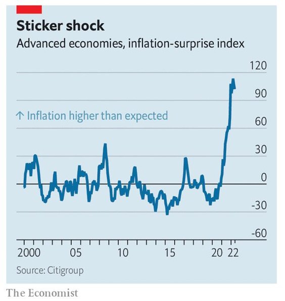 Złe wieści dotyczące inflacji wciąż nadchodzą. Ponad 9 proc. rok do roku w bogatym świecie nie było tak wysoko od lat 80. – i nigdy nie było tylu „niespodzianek inflacyjnych”, w których dane były wyższe niż prognozy ekonomistów. To z kolei odbija się na gospodarce i na rynkach finansowych. Banki centralne podnoszą stopy procentowe i kończą programy skupu obligacji, uderzając w akcje. Zaufanie konsumentów w wielu miejscach jest teraz jeszcze niższe niż w pierwszych dniach pandemii Covid-19. Wskaźniki ekonomiczne „w czasie rzeczywistym” dotyczące wszystkiego, od aktywności mieszkaniowej po produkcję przemysłową sugerują, że wzrost gospodarczy gwałtownie spowalnia - zauważa The Economist.