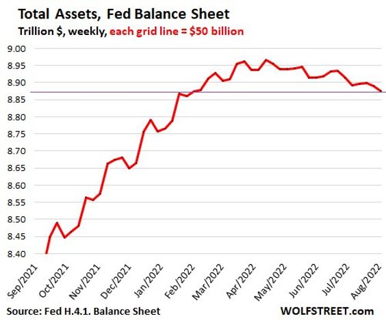 Ilościowe zacieśnienie (QT) Rezerwy Federalnej zakończyło swój drugi miesiąc trzymiesięcznego okresu wprowadzania. Łączne aktywa w tygodniowym bilansie Fed na dzień 3 sierpnia, opublikowanym po południu, spadły o 17 miliardów dolarów w porównaniu z poprzednim tygodniem i o 91 miliardów w stosunku do szczytu w kwietniu, do 8,87 biliona dolarów, najniżej od 2 lutego.