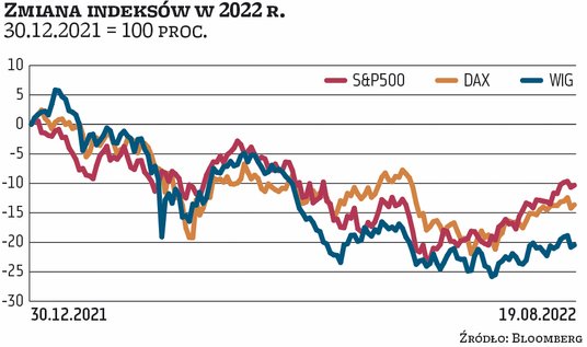 WIG po wyznaczeniu z początkiem listopada 2021 r. nowego szczytu wszech czasów wyraźnie obniżył loty. W wyniku ostatniej fali spadkowej pogłębił tegoroczną stratę do ok. 22 proc., a od szczytu hossy z jesieni na poziomie 75 tys. pkt oddalił się już o prawie 28 proc. (ok. 20 tys. pkt). Z kolei wskaźnik największych spółek WIG20 w tym roku zniżkował o ok. 26 proc., a od szczytu hossy stracił ponad 30 proc. Porównując tegoroczne stopy zwrotu spółek notowanych na szerokim rynku akcji, łatwo zauważyć, że przecenione walory stanowią wyraźną większość. W indeksie WIG akcje jedynie co czwartego uczestnika wypracowały dodatnią stopę zwrotu od początku 2022 r.