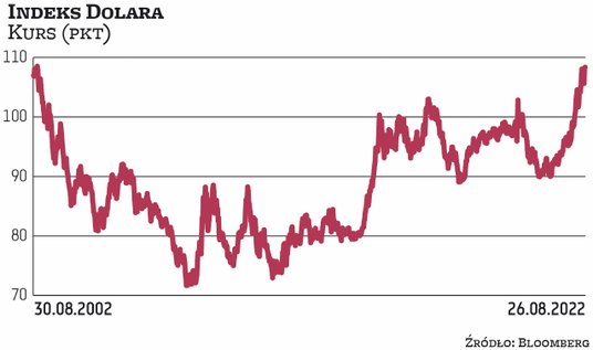 Indeks dolara znalazł się najwyżej od 20 lat (ramka 2), a nastawienie do walut europejskich pogorszyło się – co nie ominęło reprezentantów naszego regionu – za sprawą powrotu cen gazu w okolice rekordu. Złotemu ciążą odpływy kapitału zagranicznego związane z wojną rosyjsko-ukraińską i groźbą dalszego znaczącego hamowania gospodarki. Odcięcie dostaw rosyjskiego gazu w sezonie grzewczym oznaczałoby głęboką recesję w będących kluczowym partnerem gospodarczym Polski Niemczech, a do tego dochodzi brak perspektyw uruchomienia wypłat z KPO.