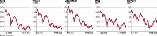Od około połowy czerwca notowania WIG20 poruszały się w głównie w bok, w zakresie szerokim na około 100 pkt. Druga połowa sierpnia przynosi zakończenie przewlekłego trendu bocznego, jednak zapewne nie takie, jakiego życzyliby sobie inwestorzy. WIG20 zniżkując w piątek o 1,79 proc., dotarł do dołka z lipca w okolicach 1600 pkt, a w poniedziałek od pierwszego dzwonka obserwowaliśmy kontynuację wyprzedaży. Po dwóch kwadransach indeks dużych spółek zniżkował do 1553 pkt, co oznaczało zniżkę o ponad 3 proc. Po pierwszej godzinie handlu WIG20 tracił około 2,1 proc., pozostając tuż nad minimami dnia. Kolejne godziny przyniosły kontynuację handlu w tych okolicach. Na czerwono wystartowały indeksy w całej Europie, co było reakcją inwestorów na zapowiedzi przedstawicieli banków centralnych, dotyczących tempa zacieśniania polityki monetarnej. – Ostatnie komentarze decydentów z banku centralnego USA zwiększyły obawy przed agresywnymi działaniami w celu stłumienia inflacji w obliczu rosnącego ryzyka recesji – wskazywał Michał Pietrzyca, analityk DM BOŚ.
