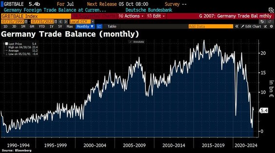 Nadwyżka handlowa Niemiec – bilans eksportu i importu towarów – wyniosła w lipcu 5,4 mld euro w ujęciu wyrównanym kalendarzowo i sezonowo, zmniejszając się z 6,2 mld euro nadwyżki w czerwcu, według danych Federalnego Biura Statystycznego Destatis. Ekonomiści spodziewali się w lipcu nadwyżki w wysokości 5,6 mld euro.