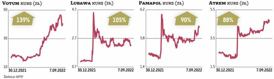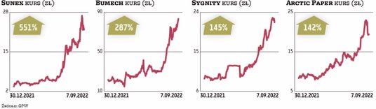 Zawirowania na rynkach związane z wojną sprawiły, że na giełdzie znalazły się nieco zapomniane spółki, które stały się beneficjentami nowej, kryzysowej rzeczywistości. Wśród firm z szerokiego rynku akcji najbardziej okazałą stopę zwrotu przyniosły akcje Sunexu, zapewniając zysk na poziomie ponad 570 proc., ustanawiając po drodze nowe rekordy notowań. Spółka, będąca jednym z największych krajowych wytwórcą produktów do instalacji OZE, wróciła do łask inwestorów już w końcówce minionego roku, ale zwyżki wyraźnie przyspieszyły w ostatnich miesiącach za sprawą rosnących oczekiwań inwestorów związanych z poprawą wyników i perspektywicznym rynkiem. W II kwartale br. przychody spółki wzrosły względem ubiegłego roku o 120 proc., do 66,8 mln zł. Pierwszy kwartał również charakteryzował się ponad 100-proc. wzrostem. Wyniki wsparła automatyzacja produkcji, która zwiększyła możliwości sprzedażowe spółki, oraz znaczący skok popularności OZE w obliczu wojny w Ukrainie i skoku cen energii.