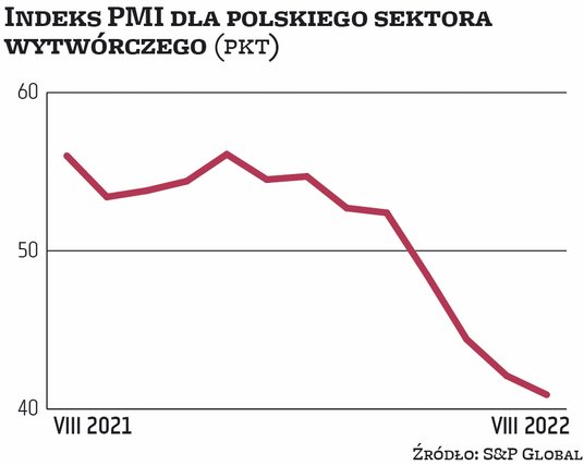 O wyraźnym pogorszeniu perspektyw sektora świadczą coraz niższe wskazania indeksu PMI, obrazującego koniunkturę w krajowym sektorze produkcyjnym, który w zakończonym niedawno miesiącu spadł do 40,9 pkt, co jest najniższym poziomem od 27 miesięcy, czyli od czasu wiosennego lockdownu z 2020 r. – wynika z badania S&P Global. Wartość wskaźnika poniżej 50 pkt oznacza spadek aktywności ekonomicznej w przemyśle, czyli jego kurczenie się.