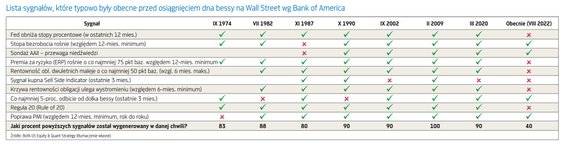 Pierwszą kwestią, która rzuca się w oczy, jest fakt, że w dołkach każdego z ostatnich czterech rynków niedźwiedzia spełnione było co najmniej 9/10 kryteriów, zaś we wcześniejszych przypadkach – co najmniej 8/10 (z tym zastrzeżeniem, że w pierwszych dwóch najstarszych przypadkach niektóre kryteria były niedostępne). Innymi słowy, typowa bessa kończyła się, gdy pojawiała się znakomita większość zestawionych sygnałów. Czy tak jest obecnie? Według stanu na sierpień spełnionych było 4/10 kryteriów, co zdaniem BofA nie upoważnia do mówienia, że mamy już oznaki końca bessy. Na ich pojawienie się trzeba więc jeszcze poczekać.
