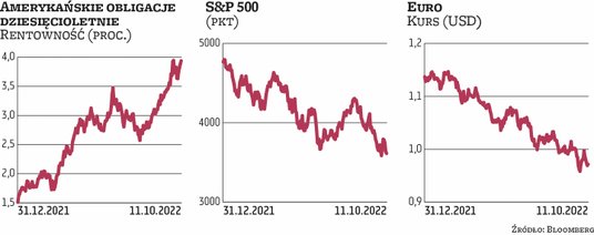 Króluje za to dolar amerykański. Euro straciło wobec niego od początku stycznia 14,5 proc. Kurs spadł poniżej parytetu i stał się najniższy od dwóch dekad. Dolar osiągnął również parytet z frankiem szwajcarskim, który stracił w tym roku 8 proc. wobec amerykańskiej waluty. Duża deprecjacja dotykała zarówno walut z rynków wschodzących, jak i rozwiniętych. O ile funt brytyjski stracił od początku roku wobec dolara 18 proc., korona szwedzka 20 proc., a jen japoński 21 proc., o tyle złoty zniżkował o 19,5 proc., a forint węgierski o 26,5 proc. Umocniły się wobec dolara jedynie nieliczne waluty, takie jak real brazylijski (+7,2 proc.) czy mało płynny rubel rosyjski (+18,1 proc.).