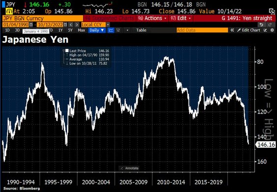 W zeszłym miesiącu japońskie władze sprzedały dolary i kupiły jena w ramach interwencji rynkowej po raz pierwszy od 24 lat, wydając 2,8 biliona jenów (19,2 miliarda dolarów), aby spowolnić gwałtowny spadek jena, który był uważany za zagrożenie dla gospodarki. 22 września japońskie Ministerstwo Finansów poleciło Bankowi Japonii (BoJ) interweniować na rynkach walutowych, kupując jena i sprzedając dolara amerykańskiego, po raz pierwszy od 1998 r. Ministerstwo Finansów Japonii może decydować o interwencjach na rynku walutowym, chociaż deleguje wdrożenie operacji na rzecz banku centralnego. Ten ruch, gdy kurs osiągnął 145,7 USDJPY, jest następstwem spadku japońskiej waluty o ponad 20 proc. w tym roku w stosunku do waluty amerykańskiej oraz ostrzeżeń Ministerstwa Finansów, że duże wahania kursów walut nie są „pożądane”.
