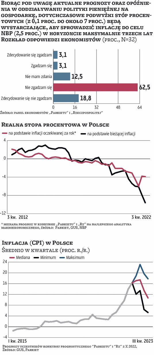Wyniki najnowszej rundy panelu ekonomistów „Parkietu” i „Rzeczpospolitej” – cyklicznej sondy prowadzonej w gronie wybitnych naukowców – sugerują jednak, że przy aktualnej postawie RPP wątpliwy jest nawet powrót inflacji do celu NBP w horyzoncie trzech lat, czyli do jesieni 2025 r. Uczestnikom panelu przedstawiliśmy do oceny taką tezę: „Biorąc pod uwagę aktualne prognozy oraz opóźnienia w oddziaływaniu polityki pieniężnej na gospodarkę, dotychczasowe podwyżki stóp procentowych (z 0,1 proc. do około 7 proc.) będą wystarczające, aby sprowadzić inflację do celu NBP (2,5 proc.) w horyzoncie maksymalnie trzech lat”. Zgodził się z nią zaledwie jeden (3 proc.) spośród 31 ekonomistów, którzy wzięli udział w badaniu. Przeciwnego zdania było 26 (84 proc.) ankietowanych.