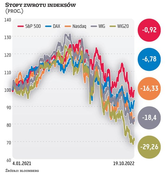 – Sytuacja zarówno WIG20, jak i S&P 500, zrobiła się w ostatnim czasie interesująca. Oba indeksy odbiły się od wsparć na poziomie lokalnych minimów z przełomu września i października, dając nadzieję na silniejsze odreagowanie po miesiącach spadków – komentuje Przemysław Smoliński, analityk BM PKO BP. – Zarazem jednak na razie wzrost nie był na tyle silny, by pokonane zostały krótkoterminowe opory na poziomie szczytów z początku października. Dopiero od ich testu zależeć będzie sytuacja w średnim horyzoncie – twierdzi Smoliński, Zdaniem analityka BM PKO BP przełamanie wspomnianych poziomów otworzyłoby drogę dla dalszych zwyżek. – W przypadku WIG20 moglibyśmy liczyć na ruch w kierunku górnego ograniczenia średnioterminowego kanału spadkowego w okolicy 1650 pkt, S&P 500 zaś mógłby zwyżkować do linii trendu spadkowego, łączącej szczyty z poprzednich miesięcy. Oznaczałoby to powrót amerykańskiego indeksu powyżej 4000 pkt – przewiduje Smoliński.