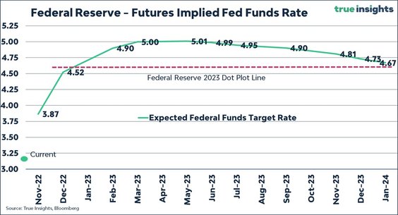Kontrakty terminowe na fundusze federalne wyceniły szczytową stopę funduszy federalnych na poziomie 4,97 proc., osiągając w maju 2023 r. Rynek kontraktów terminowych wycenił również 91 proc. szans na podwyżkę stóp o 75 pb w listopadzie i około 75 proc. prawdopodobieństwo kolejnego wzrostu o 75 pb. w grudniu.