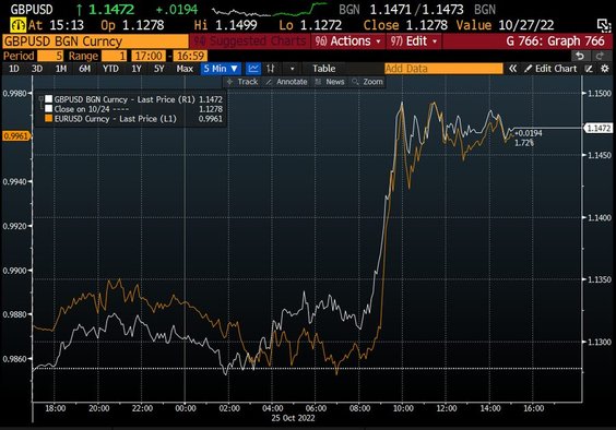 We wtorek funt szterling osiągnął sześciotygodniowe maksimum w wyniku poprawy nastrojów związanych z ryzykiem, gdy Rishi Sunak został premierem Wielkiej Brytanii, podczas gdy dolar spadł do trzytygodniowego minimum, ponieważ słabnące dane gospodarcze z USA ostudziły oczekiwania co do tempa przyszłych podwyżek stóp procentowych w USA.