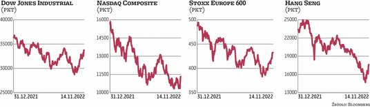 Poniedziałkowa sesja w USA zaczęła się od lekkich spadków. Indeks S&P 500 tracił na jej początku 0,4 proc. Dwie poprzednie sesje przyniosły mu zwyżkę o łącznie 6,5 proc., a indeksowi Nasdaq Composite wzrost o 9,4 proc. Nastroje inwestorów wyraźnie poprawiły się w ostatnich dniach, a mocno przyczynił się do tego czwartkowy odczyt amerykańskiej inflacji za październik. Wyhamowała z 8,2 proc. do 7,7 proc., co dało nadzieję, że Fed już w grudniu wyhamuje tempo zacieśniania polityki pieniężnej i podwyższy stopy o mniej niż 75 pkt baz. Te nadzieje osłabiły w ostatnich dniach dolara i sprawiły, że rentowność amerykańskich obligacji dziesięcioletnich spadła w okolice 3,9 proc. Na jak długo może starczyć ten optymizm na rynkach?