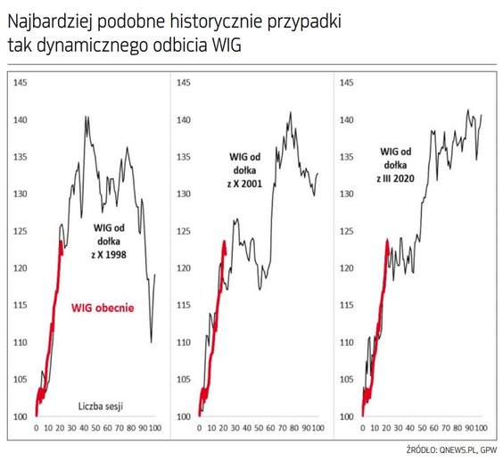 Spośród licznych historycznych przypadków wybraliśmy te trzy, które cechują się na stan z dnia pisania tej analizy największym podobieństwem do obecnej sytuacji. Okazuje się, że WIG ostatnio zachowywał się tak jak po wyjściu z dołków bessy odnotowanych w październiku 1998 r., październiku 2001 r. i marcu 2020 r.