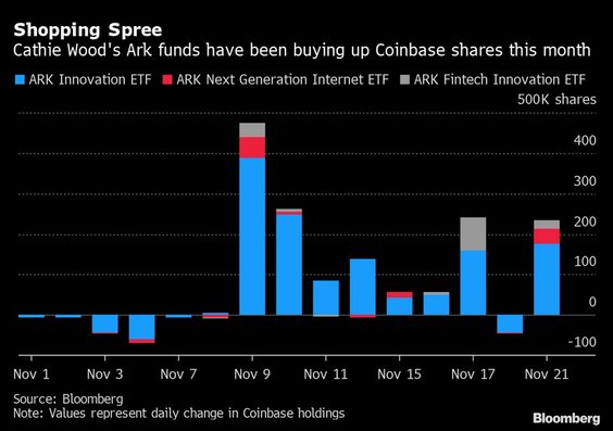 Większość zasobów Ark’s Coinbase pochodzi z flagowego funduszu ETF ARK Innovation, który ma prawie 6 milionów akcji o wadze około 3,6 proc., co stanowi 13. największą pozycję funduszu. Podczas gdy ARK Next Generation Internet ETF i ARK Fintech Innovation ETF posiadają tylko nieco ponad 1 milion akcji, waga Coinbase w tych dwóch funduszach jest znacznie wyższa i wynosi odpowiednio 5,4 proc. i 6,3 proc., zgodnie z danymi na stronie internetowej Ark.