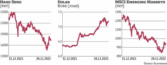 Ropa gatunku WTI traciła podczas poniedziałkowej sesji nawet ponad 3 proc., a jej cena zeszła rano poniżej 74 USD za baryłkę. Stała się ona najtańsza od grudnia 2021 r. Traciły również inne surowce. Kontrakty terminowe na miedź i rudę żelaza spadały o około 2 proc. Bezpośrednim impulsem dla przeceny na rynkach surowcowych stały się wydarzenia w Chinach. W wielkich miastach Państwa Środka doszło do fali gwałtownych protestów przeciwko restrykcjom pandemicznym. Inwestorzy znów zaczęli się niepokoić o kondycję gospodarki chińskiej, o stabilność łańcuchów dostaw i o popyt generowany przez drugą pod względem wielkości gospodarkę świata. Giełda w Hongkongu zareagowała na te protesty ostrą wyprzedażą. Hang Seng, jej główny indeks, tracił w ciągu sesji nawet ponad 4 proc., ale ostatecznie zamknął się tylko 1,6 proc. na minusie. Juan osłabł o 0,5 proc. wobec dolara (od początku roku stracił już prawie 12 proc.) Reakcja innych rynków akcji i walut była bardziej powściągliwa. Większość europejskich indeksów giełdowych umiarkowanie traciła po południu. Inwestorzy czekali na więcej informacji z Chin – o prawdziwej skali protestów i o tym, jak mogą one wpłynąć na politykę pandemiczną w Państwie Środka.