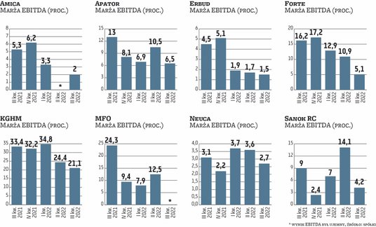 Wynikami w tym roku rozczarowuje KGHM, do czego w dużej mierze przyczyniły się koszty, które rosły szybciej niż przychody. Jak zauważa Łukasz Prokopiuk, analityk DM BOŚ, miedziowy koncern jak większość spółek wydobywczych ma stosunkowo wysoki udział kosztów stałych. – Stąd wysoki poziom inflacji na świecie musiał uderzyć też w KGHM. Okazała się jedną z najbardziej poszkodowanych przez kryzys energetyczny wśród analizowanych przez nas spółek. Będąc dużym nabywcą netto energii elektrycznej i gazu, spółka jest szczególnie wrażliwa na rosnące koszty energii, ale odmiennie niż inne spółki wydobywcze (JSW czy Bogdanka) nie jest w stanie wykorzystać tej sytuacji z pożytkiem dla strony przychodowej – tłumaczy. Z drugiej strony, jak zauważa Robert Maj, analityk Ipopemy, do tej pory KGHM negatywne czynniki był w stanie łagodzić relatywnie wysokimi cenami miedzi i mocniejszym dolarem. – Ryzykiem pozostają wydarzenia w Chinach, obostrzenia covidowe i możliwe ponowne zakłócenia w łańcuchach dostaw, co w połączeniu z recesją gospodarczą może wpłynąć na popyt na miedź w kolejnych miesiącach i kwartałach – zauważa.