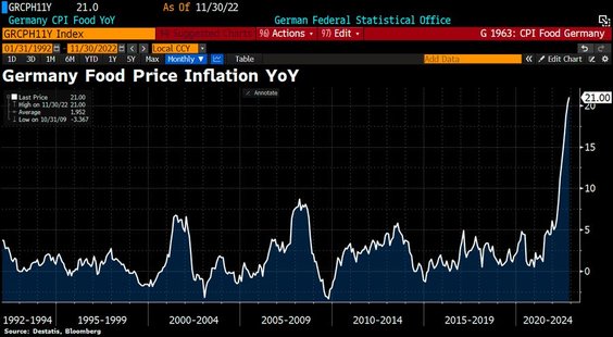 Według wstępnego odczytu niemieckiego Federalnego Urzędu Statystycznego (Destatis) roczne tempo wzrostu wskaźnika cen konsumpcyjnych spadło z 10,7 proc. w październiku do 10,0 proc. w listopadzie. Tymczasem ceny w supermarketach wciąż rosną. Niemiecki CPI żywności podskoczył w listopadzie o 21 proc. r/r, co jest najwyższą #inflacją cen żywności od początku statystyk i znacznie wyższą niż w innych krajach strefy euro. We Włoszech inflacja żywności wynosi 14 proc., a w Hiszpanii 16 proc.