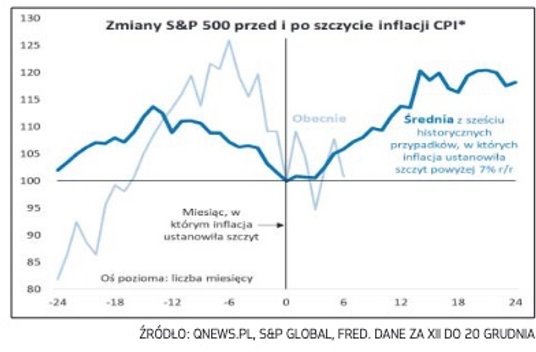 Nie ma większych wątpliwości co do tego, że jedną z przyczyn tegorocznej zawieruchy na rynkach akcji był wystrzał wskaźników inflacji do wielodekadowych maksimów, zmuszający banki centralne do jastrzębiej reakcji. O ile w Polsce na szczyt inflacji ciągle czekamy, o tyle w USA prawdopodobnie jest już za nami. Wskaźnik CPI swoje maksimum ustanowił już w czerwcu br. na poziomie 9 proc. rok do roku i od tego czasu stopniowo schodzi w dół (w listopadzie znalazł się najniżej od grudnia 2021 r. – 7,1 proc. r./r.). Intuicyjnie spadek inflacji (dezinflacja) wydaje się zjawiskiem pozytywnym i taki też jest wydźwięk danych historycznych. Pod lupę wzięliśmy sześć historycznych przypadków, począwszy od lat 50. XX wieku, w których inflacja CPI ustanowiła szczyt powyżej umownego progu 7 proc. Chociaż nie wszystkie przypadki przyniosły hossę na Wall Street, to jednak uśredniona ścieżka S&P 500 jest ewidentnie rosnąca. Po 18 miesiącach od szczytu inflacji indeks był średnio 16 proc. wyżej. T.H.