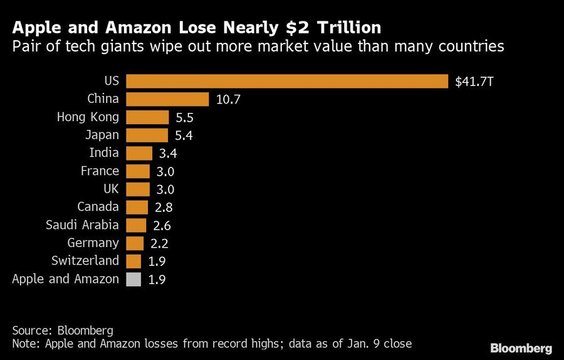 Producent iPhone'a stracił 916 miliardów dolarów od szczytu w styczniu 2022 roku, podczas gdy gigant e-commerce spadł o 991 miliardów dolarów od szczytu w lipcu 2021 roku.