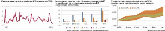 Taki fundamentalny wskaźnik możemy wykorzystać jako dobry barometr obecnie panujących wycen na rynku. Jednocześnie okazuje się, że bieżący poziom wskaźnika jest skutecznym predyktorem oczekiwanych stóp zwrotu z indeksu w kolejnych latach. Analizie poddane zostały stopy zwrotu wyznaczone przez zmianę wartości indeksu WIG dla inwestycji rozpoczętej każdego miesiąca w latach 1995–2022. Dodatkowo zostały one podzielone na grupy ze względu na wartość wskaźnika P/E w momencie rozpoczęcia inwestycji. Przedziały wartości wskaźnika wyznaczono jako mniejsze niż 7,5, mniejsze niż 10, między 10 a 15, między 15 a 20 oraz powyżej 20.