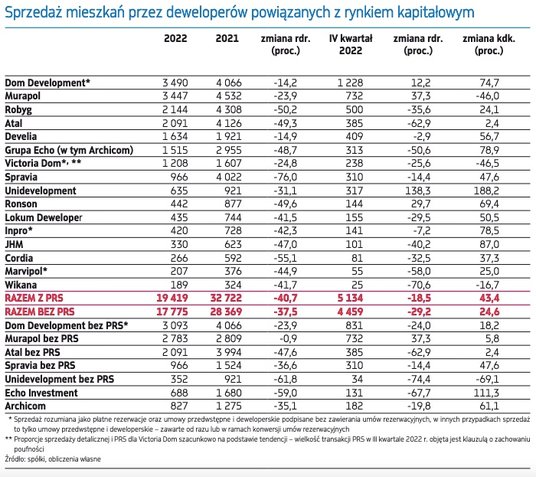 Zgodnie z danymi udostępnionymi przez 16 związanych z rynkiem kapitałowym deweloperów (w tym spółki zależne notowanych grup budowlanych i podmioty związane historycznie), w 2022 r. nabywców indywidualnych i instytucjonalnych znalazło 19,4 tys. mieszkań, o 41 proc. mniej niż rok wcześniej. Wynik bez transakcji PRS można tylko szacować, ponieważ Victoria Dom nie ujawnia struktury sprzedaży – związana jest klauzulą o zachowaniu poufności. Dla Victorii dokonaliśmy zatem hipotetycznego szacunku na podstawie danych z innych kwartałów i tendencji rynkowych, co pozwala ostrożnie stwierdzić, że cała grupa analizowanych firm sprzedała nabywcom indywidualnym blisko 17,8 tys. lokali, o 38 proc. mniej niż rok wcześniej. Warto pamiętać, że zestawienie to nie ranking.