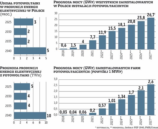 PGE Energia Odnawialna, z grupy PGE, zakończyła w 2022 r. prace budowlane na 19 farmach fotowoltaicznych o mocy do 1 MW, które wygrały w 2021 r. aukcję na sprzedaż energii elektrycznej w instalacjach odnawialnych źródeł energii. Dotychczas spółka dysponowała farmami o łącznej mocy jedynie 4,6 MW. W 2023 r. będzie to już ok. 200 MW. W tym roku zakończone lub jeszcze kontynuowane będą projekty PV Jeziórko 1 i 2 (100 MW), Augustynka (25 MW), Huszlew 1 i 2 (5 i 8 MW) i Gutki 1 i 2 (6 i 6 MW). W tym roku PGE rozpocznie także budowę 10 projektów: PV Wrzosów – 32 MW, PV Srebrzyszcze – 60 MW, PV Żółtańce 1 – 5 MW, PV Żółtańce 2 – 5 MW, PV Żółtańce 3 – 5 MW, PV Jedlanka Stara – 5 MW, PV Pokrzywnica – 7 MW, PV Kleszczów – 50 MW, PV Tyszki Wądołowo – 10 MW, PV Jeziórko 3 – 30 MW. Spółka będzie się też ubiegać o warunki przyłączenia dla kolejnych projektów o łącznej mocy 500–600 MW.