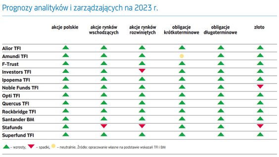 Mocno pozytywnie o papierach skarbowych mówi TFI PZU. Jak podano w prognozach na 2023 r., w Polsce i na świecie dojdzie do spadku inflacji. Jednocześnie TFI PZU przewiduje nadejście spowolnienia w gospodarce, co łącznie daje „zielone światło” obligacjom. „Na horyzoncie widać także koniec bessy na rynku akcji, ale jeszcze w najbliższych miesiącach negatywny wpływ na zachowanie się giełdowych indeksów mogą mieć spadające zyski spółek” – analizuje TFI PZU. – Na rynkach będzie nam towarzyszyła zmienność, która przełoży się na zachowanie akcji, obligacji i surowców, a także może zmuszać do aktywnego zarządzania funduszami czy portfelami. W tym kontekście ważne będzie inwestowanie w płynne aktywa. Co nie zmienia faktu, że w otoczeniu spowolnienia gospodarczego zwykle najlepiej radziły sobie obligacje – mówił Piotr Dmuchowski, wiceprezes TFI PZU odpowiedzialny za dział inwestycji. W całym roku TFI PZU oczekuje także dodatnich stóp zwrotu z akcji, chociaż – ze względu na oczekiwane pogorszenie się zysków spółek w wyniku spowolnienia gospodarczego – w nadchodzących miesiącach możemy jeszcze obserwować bardzo dużą zmienność. – Pozytywny, trwalszy ruch na giełdach możemy zobaczyć w momencie zbliżania się do końca recesji, kiedy inwestorzy zaczną poszukiwać spółek i sektorów mogących być wygranymi kolejnej hossy – dodaje Dmuchowski.