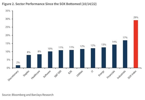 Indeks półprzewodników w Filadelfii zyskał w poniedziałek aż 3%, zwiększając wzrost do ponad 30% z dwuletniego minimum w połowie października. To dużo więcej niż około 10% wzrost zaawansowanego technologicznie indeksu Nasdaq 100 w tym samym okresie.