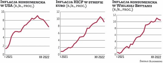 Komitet Otwartego Rynku Rezerwy Federalnej (FOMC) ma podjąć decyzję w sprawie stóp w środę wieczorem. O ile na czterech zeszłorocznych posiedzeniach podnosił on główną stopę procentową po 75 pkt baz., a na grudniowym o 50 pkt baz., o tyle większość analityków spodziewa się, że na najbliższym posiedzeniu podniesie ją już tylko o 25 proc., do przedziału wynoszącego 4,5 proc. – 4,75 proc. Będzie ona o 450 pkt baz. wyższa niż rok wcześniej. Europejski Bank Centralny i Bank Anglii będą natomiast podejmować decyzje w czwartek. W przypadku EBC średnio oczekiwana jest podwyżka stóp o 50 pkt baz. Główna może więc zostać podniesiona do 3 proc., a depozytowa do 2,5 proc. Również w przypadku Banku Anglii najczęściej spodziewana jest podwyżka o 50 pkt baz., w ramach której główna stopa ma dojść do 4 proc., czyli najwyższego poziomu od jesieni 2008 r. Dalsza ścieżka podwyżek stóp procentowych w USA, strefie euro i Wielkiej Brytanii jest natomiast dużo bardziej niepewna.