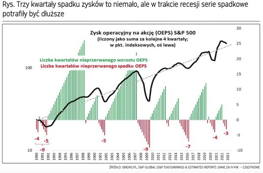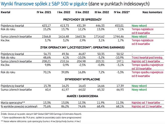 Zacznijmy jednak od szukania pozytywów. Te najłatwiej znaleźć w przypadku wypłaconych dywidend, które osiągnęły rekordowe pułapy. To potwierdza, że wypłaty z zysków są dużo stabilniejszą pozycją niż zyski, bo w warunkach amerykańskich wiele spółek stara się o utrzymanie stabilnej polityki dywidendowej. Drugi pozytyw to rekordowe przychody ze sprzedaży, zarówno w pojedynczym kwartale, jak i liczone jako suma za cztery kolejne kwartały (oba ujęcia pokazujemy w tabeli).