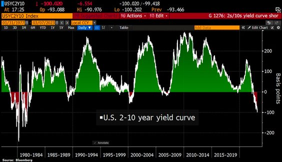 Od lipca rentowności dwuletnich Treasuries są wyższe niż rentowności 10-letnich Treasuries. Odwrócenie to osiągnęło we wtorek minus 103,1 punktów bazowych, gdy rentowności krótkoterminowe gwałtownie wzrosły, co stanowi największą różnicę między rentownościami krótkoterminowymi i długoterminowymi od września 1981 r. W tym czasie gospodarka znajdowała się w pierwszych miesiącach recesji, która miała trwać do listopada 1982, stając się wówczas najgorszym upadkiem gospodarczym od czasu Wielkiego Kryzysu.