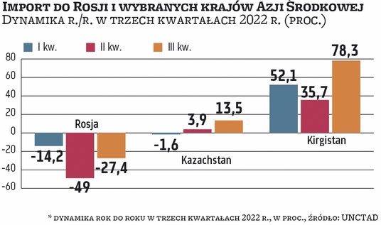 Jeśli chodzi o rozwijanie zasobów – nie tylko wojennych, ale i umożliwiających normalne funkcjonowanie gospodarki – to nie próżnują także Rosjanie. Jak wynika z wykresu zaproponowanego przez prof. Jacka Tomkiewicza z Akademii Leona Koźmińskiego, załamanie rosyjskiego importu nie musi wskazywać na skuteczność sankcji, mających odciąć Rosję od światowych rynków. – Porównanie danych o dynamice eksportu do Rosji i jej sąsiadów z centralnej Azji pokazuje szybko rosnący import do krajów blisko związanych gospodarczo z Rosją. Powstaje pytanie: czy w Kirgistanie tak szybko rośnie zapotrzebowanie na zmywarki, pralki i samochody, czy to raczej dowód na to, że znaleziono sposób na unikanie nałożonych sankcji? – pyta retorycznie prof. Tomkiewicz.