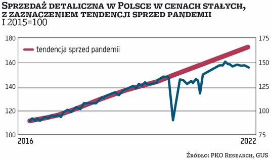 Jak dodaje, zjawisko to było tuszowane przez impuls popytowy wynikający z napływu uchodźców z Ukrainy. Jednak według niego w nadchodzących miesiącach w ujęciu rok do roku efekt ten zaniknie. To oznacza, że krajowego konsumenta mogą czekać chude miesiące, a pewnej poprawy sytuacji można spodziewać się pod koniec tego roku – dopiero wówczas obniżanie się inflacji pozwoli na poprawę realnych dochodów.
