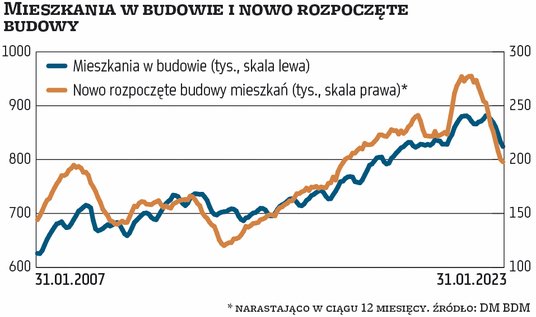Na inne niekorzystne zjawisko w gospodarce wskazuje Krzysztof Pado z DM BDM. Po tym, jak w połowie 2022 r. liczba mieszkań w budowie sięgnęła 882 tys., zaczęła systematycznie się obniżać. Jego zdaniem na to, że tendencja ta nabierze jeszcze tempa, wskazuje skala spadku liczby rozpoczynanych budów.