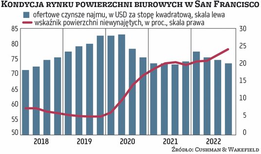 Duzi pracodawcy w mieście, tacy jak Alphabet czy bank Wells Fargo, wprowadzili politykę trzech dni w biurze w ciągu tygodnia, a wiele mniejszych firm w ogóle nie oczekuje od pracowników powrotu do biura. W poprzednich dwóch latach wiele firm ograniczyło metraż powierzchni biurowej w mieście lub pozwoliło wygasnąć umowom najmu całkowicie. Jak przypomina Żółkiewicz, od początku roku widać więcej przypadków niewypłacalności globalnych funduszy nieruchomości, za które odpowiadają problemy dotyczące rynku biurowego (przykład to należący do PIMCO Columbia Property Trust).