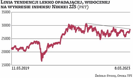 – Nikkei 225 atakuje linię tego trendu, a jeżeli ją przełamie, to będzie miał otwartą drogę do wyraźnych zwyżek. W zasięgu zdecydowanie jest szczyt wszech czasów ustanowiony ponad 30 lat temu, bo w 1989 r., choć obecne notowania wciąż jeszcze dzieli od niego spory dystans – zauważa Tarczyński.