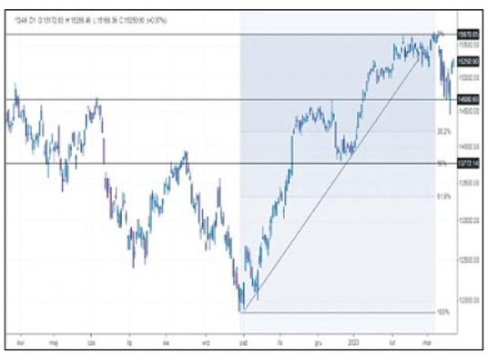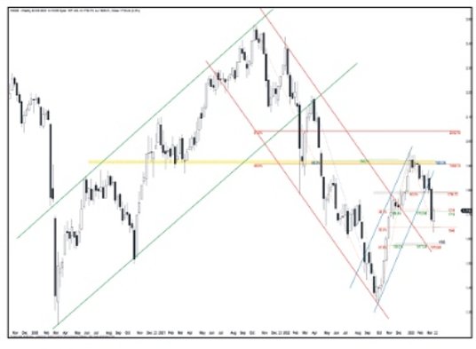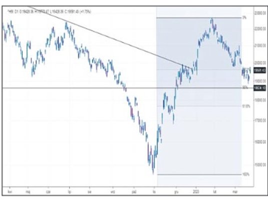 Artur Wizner z DM BPS odczytuje ostatnie tygodnie w wykonaniu WIG20 jako trend spadkowy, korygujący silną falę wzrostową, która trwała od października 2022 r. do początku stycznia 2023 r. – W ostatnim tygodniu miała miejsce dynamizacja spadków, przetestowany został poziom 50 proc. zniesienia Fibonacciego wspomnianej fali wzrostowej i jednocześnie utworzyła się formacja gwiazdy porannej, przynosząca trochę optymizmu z technicznego punktu widzenia – tłumaczy. W jego ocenie również najbliższe opory znajdują się już w okolicach 1800 pkt i wynikają z górnego ograniczenia konsolidacji, w której indeks przebywał od połowy listopada do końca grudnia 2022 r. oraz lokalnego minimum z 22 lutego 2023 r. – Dopiero pokonanie tego poziomu otworzyłoby drogę do dalszych zwyżek. Aktualnie indeks znajduje się na poziomie 38,2 proc. wspomnianego zniesienia Fibonacciego, które pełni rolę wsparcia, a kolejne można lokalizować na poziomie 1690 pkt, gdzie aktualnie przebiega średnia 200-sesyjna oraz 1626 pkt (minimum z 20 marca) – zauważa Wizner.