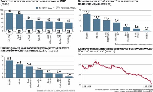 W przypadku ING Banku Śląskiego wskaźnik pokrycia wzrósł w ciągu roku do 88 proc., z 46 proc. Ciekawe, że o ile Pekao i ING BSK mają relatywnie mało kredytów w CHF (ich wartość bilansowa przed korektą o rezerwy wynosiła na koniec 2022 r. odpowiednio 2,6 mld zł oraz 0,7 mld zł), o tyle w przypadku podmiotów znacznie mocniej obciążonych kredytami walutowymi postęp był wyraźnie mniejszy.