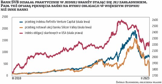 Zamknięcie przez amerykański nadzór zarówno Silicon Valley Banku, głównej instytucji obsługującej sektor technologicznych start-upów, jak i Signature Banku, jednego z czołowych banków związanych z rynkiem kryptowalut, moim zdaniem można potraktować jako kolejną odsłonę trwającego od końca 2021 r. dramatu – pęknięcia bańki spekulacyjnej na rynku kryptowalut i spółek technologicznych oraz gwałtownego wzrostu stóp procentowych. Ten spektakularnie szybki i niespodziewany upadek szesnastego pod względem wartości aktywów banku w USA był efektem gwałtownego odpływu depozytów, który nastąpił tuż po ogłoszeniu (w Dniu Kobiet) przez władze banku straty w wysokości 1,8 mld dolarów zrealizowanej ze sprzedaży obligacji skarbowych i związanej z nią planowanej emisji akcji celem pokrycia ubytku w kapitałach własnych banku. Sprzedaż papierów dłużnych była wymuszona trwającym od dłuższego czasu ciągłym odpływem depozytów, które w banku SVB w większości należały do nowo powstałych spółek technologicznych. Po tym, jak w 2022 r. rynek IPO i SPAC praktycznie wysechł jako źródło pozyskania nowego kapitału, a pożyczki w bankach stały się droższe i trudniejsze do zdobycia, start-upy z Doliny Krzemowej, które niemal z definicji „przepalają” gotówkę w pierwszych latach funkcjonowania, zostały zmuszone do korzystania jedynie z pozyskanych wcześniej środków. Efektem był trwający od początku 2022 r. ciągły spadek bazy depozytowej w banku Silicon Valley, ze 189 mld USD do 173 mld USD na koniec 2022 r. Odpływ depozytów ułatwiał fakt, że niemal połowa środków zgromadzonych na rachunkach w tym banku (jak i w wielu innych) była trzymana na nieprzynoszących odsetek depozytach na żądanie. W tej sytuacji informacja o stracie SVB ze sprzedaży obligacji wywołała lawinę kolejnych wniosków o zamknięcie depozytów – 9 marca wartość wycofywanych środków sięgnęła 42 mld USD. Nastąpił klasyczny run na bank, który skończył się jego upadkiem i wkroczeniem nadzoru.