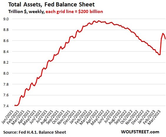 Bilans Rezerwy Federalnej spadł o 101 miliardów dolarów w ciągu dwóch tygodni – o 74 miliardy dolarów w bieżącym tygodniu i o 27 miliardów dolarów w poprzednim tygodniu – do 8,63 biliona dolarów, ponieważ zacieśnianie ilościowe (QT) trwało w normalnym tempie, a banki zaczęły płacić wsparcia płynności oferowanego przez Fed, kiedy upadł Silicon Valley Bank i Signature Bank, a tydzień później, kiedy pod naciskiem regulatorów Suisse Credit Suisse został przejęty przez UBS.