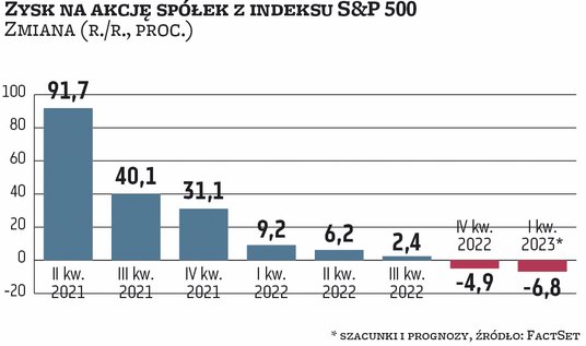 Sezon wyników kwartalnych w USA już się rozpoczął, choć do jego nieoficjalnej inauguracji dojdzie dopiero w piątek, gdy raporty za miniony kwartał opublikują wielkie banki z Wall Street – Citigroup, JPMorgan Chase i Wells Fargo. Do czwartkowego otwarcia sesji wyniki opublikowało 21 spółek wschodzących w skład indeksu S&P 500. Aż 19 z nich pozytywnie zaskoczyło wielkością zysków, a 12 miało przychody wyższe od prognoz. Ogólnie jednak analitycy spodziewają się, że ten sezon wyników będzie dość słaby. Według danych firmy badawczej FactSet prognozowany spadek zysków na akcje spółek z S&P 500 wyniesie 6,8 proc. rok do roku. Może więc być większy niż za IV kwartał 2022 r. (gdy sięgnął 4,9 proc.) i wygląda na to, że będzie też największy od II kwartału 2020 r., czyli okresu lockdownów covidowych (gdy zyski na akcje tąpnęły aż o 31,8 proc.).