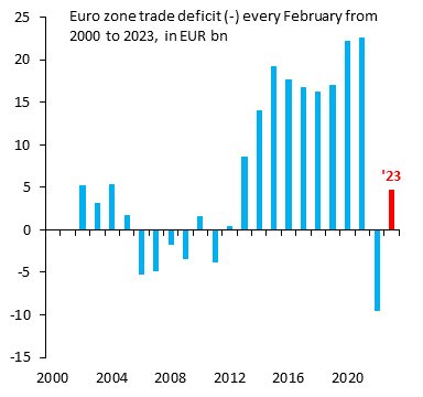 Po uwzględnieniu wahań sezonowych lutowy bilans handlowy był niewielkim deficytem w wysokości 100 mln euro, ale ogromną poprawą w stosunku do deficytu 11,6 mld euro z poprzedniego miesiąca.