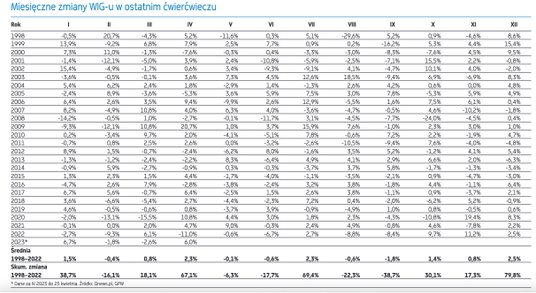 Można zatem śmiało powiedzieć, że rosnąc od końca września 2022 r. do chwili pisania tego artykułu łącznie o ponad 35 proc., WIG wyśmienicie wykorzystał sprzyjającą sezonowość, bowiem historycznie w tym okresie zyskiwał średnio łącznie ponad 9 proc. Norma została pobita w rewelacyjnym stylu!