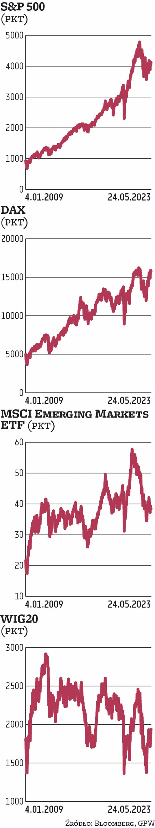 O tym, że ryzyko nie jest w cenie, świadczy też spadkowa tendencja wskaźnika koniunktury na rynkach wschodzących. MSCI Emerging Markets do środy zniżkował o 1,5 proc. i stanowi to kontynuację trwającego od połowy kwietnia trendu. Słabo radzą sobie najważniejsze indeksy parkietów azjatyckich. Do czwartku w Hongkongu spadek sięgał 3,7 proc., a tendencja ta utrzymuje się od ośmiu tygodni. Niewiele lepsza jest sytuacja w Szanghaju, gdzie zniżka wyniosła 2,5 proc., a od kilku tygodni dostrzegalne są spore wahania. Mocno w górę szedł indeks giełdy w Atenach, ale rosły także wskaźniki parkietu ukraińskiego i moskiewski MOEX. Większość wskaźników naszego regionu jednak traciła na wartości. Spadki dominowały również na głównych giełdach europejskich. We Frankfurcie zniżka do czwartkowego poranka sięgała niemal 2,8 proc., co można uznać za korektę przekraczającej 2 proc. zwyżki z poprzedniego tygodnia. O 3,8 proc. w dół szedł indeks parkietu w Mediolanie, a paryski CAC 40 zniżkował o ponad 3,5 proc.