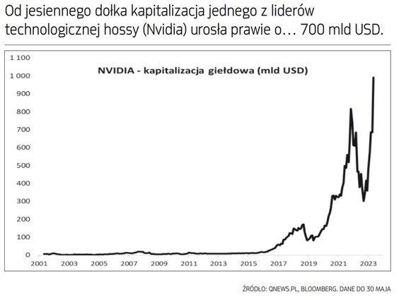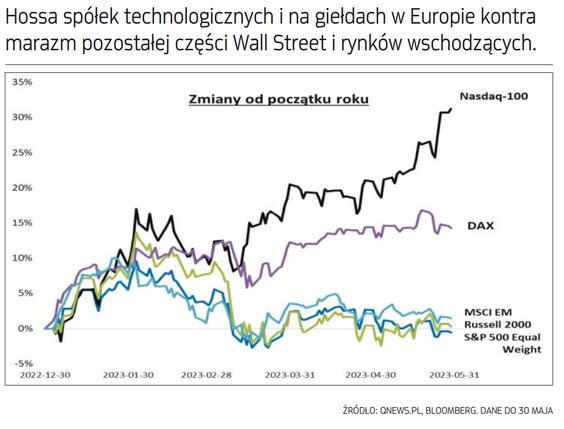 Bezsprzecznym liderem pierwszych pięciu miesięcy 2023 okazały się amerykańskie giganty technologiczne. Ścisła elita kilku korporacji zdecydowanie zdominowała stopy zwrotu. Wyrazem tego był spektakularny rajd indeksu Nasdaq 100, który w momencie pisania tego artykułu znalazł się przeszło 30 proc. na plusie od początku roku. To w przytłaczającym stopniu dzieło akcji garstki spółek typu Microsoft, Apple, Nvidia, Amazon, Meta, Alphabet itp.