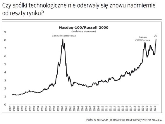 O ile jeszcze np. rynki europejskie (np. niemiecki DAX) próbowały w jakimś stopniu dotrzymywać kroku technologicznej elicie zza oceanu – co zresztą pozytywnie rzutowało na polską giełdę, której więcej miejsca poświęciliśmy przed dwoma tygodniami – o tyle pozostała część Wall Street wypadła... słabo. Wspinaczka Nasdaq 100 pozostawiła w cieniu tzw. szeroki rynek, gdzie po początkowym noworocznym zrywie później zapał kupujących zupełnie zgasł. O ile jeszcze S&P 500 z mozołem wspinał się dzięki ważącym sporo liderom z indeksu Nasdaq, o tyle już nieważona wersja tego samego indeksu (Equal Weighted – każda spółka ma w nim równą wagę) kończyła pierwsze pięć miesięcy roku ze zmianą w okolicach... zera. To samo dotyczy zresztą jeszcze innego segmentu amerykańskiej giełdy, czyli licznych małych spółek – reprezentujący je Russell 2000 również nie zrobił w pierwszej części roku żadnych postępów.