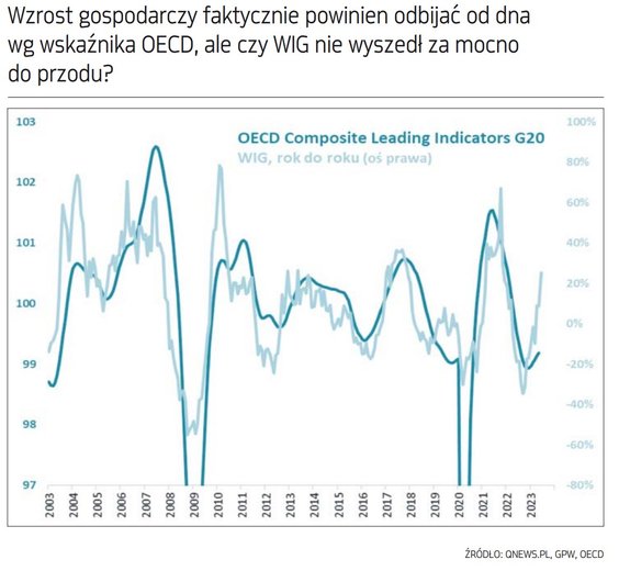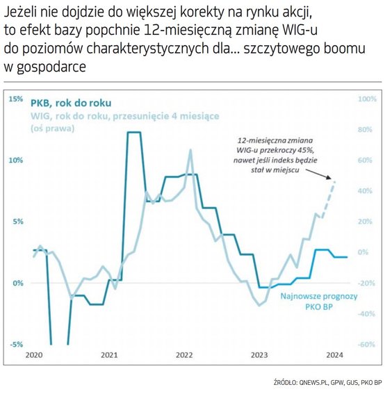 Ponieważ korelacja między WIG-iem i PKB w ostatnich kilku latach była bliska ideału (w dawniejszych dziejach poziom korelacji był zmienny), to aż dosłownie prosi się, by spróbować wywnioskować na tej podstawie, co rynek akcji ma nam do powiedzenia odnośnie do koniunktury gospodarczej. Otóż wygląda na to, że jest to wizja... bardzo optymistyczna. Dosłowne potraktowanie naszego wykresu sugerowałoby, że obecna dynamika WIG-u – w końcówce półrocza – dyskontuje, ze wspomnianym wyprzedzeniem, skok rocznej zmiany PKB do... +6 proc. w okolicach IV kwartału (biorąc poprawkę na konwersję między danymi miesięcznymi i kwartalnymi – miesięczne sugerują okolice października).